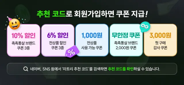 미트리 추천인 코드로 회원가입 하면 10% 할인쿠폰과 전상품 1,000원 쿠폰을 지급합니다.